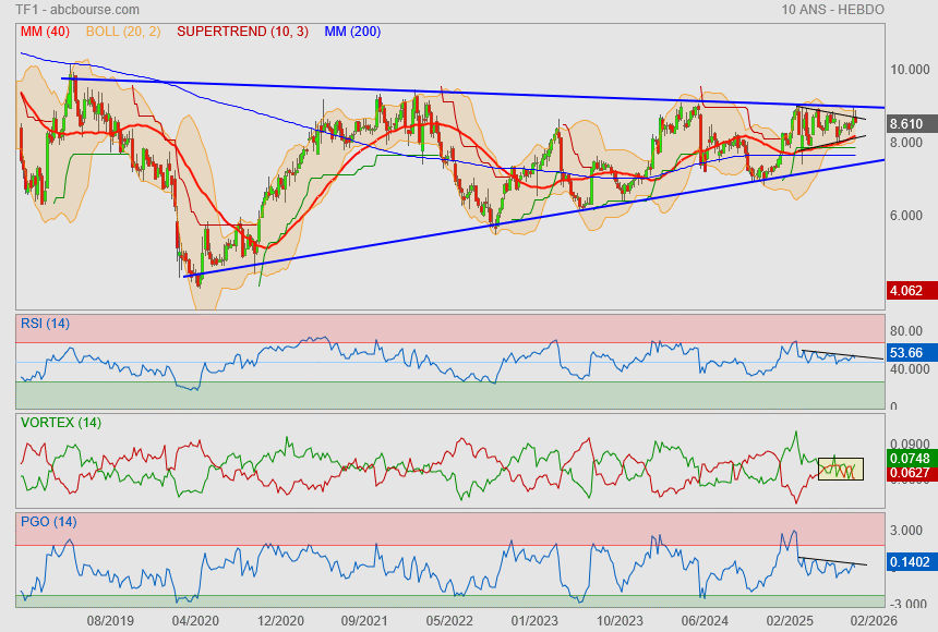 (Boursier.com) — TF1 avance de 4% à 8,2 euros, recherché après l'annonce de résultats annuels en légère progression et le versement d'un dividende de 0,60 euro par action. Pour 2025, dans un marché publicitaire offrant une visibilité limitée, les perspectives du Groupe sont les suivantes : une croissance soutenue à deux chiffres du chiffre d'affaires digital ; le maintien d'une marge des activités proche de celle de 2024 ; et viser une politique de dividendes en croissance dans les prochaines années.