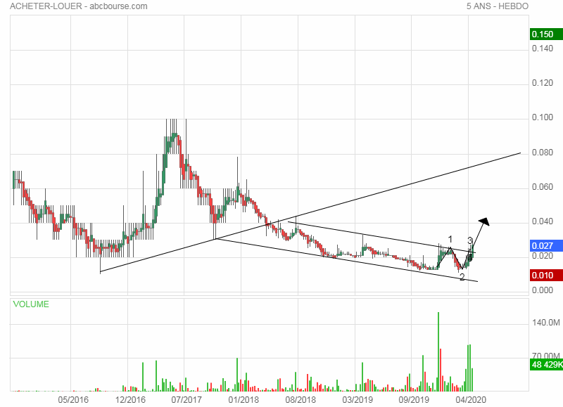 la journee ou la semaine va nous donner le signal a suivre au dessus du canal baissié c'est le grand rebond,en dessous on conserve pour le prochain test car c'est ce qui se joue une sortie dun canal baissé de congestion -la moyenne mobile en rouge debute la pente positive -ce qui laisse supposer qu'on a un mouvement dans la durée- les bollinguers sont serrées depuis des mois et a l'ecartement ,il y a generalement un mouvement d'ampleur .LE RSI EST EN DESSOUS DE SON SIGNAL 50- au dela la force acheteuse surpasse les vendeurs,le rsi est dans la bonne direction pour les franchir ,voir precedent mouvement de hausse sur le graphe.Enfin les volumes sont importants depuis plusieurs jours ,remarquables depuis 5 ans en hebdo .