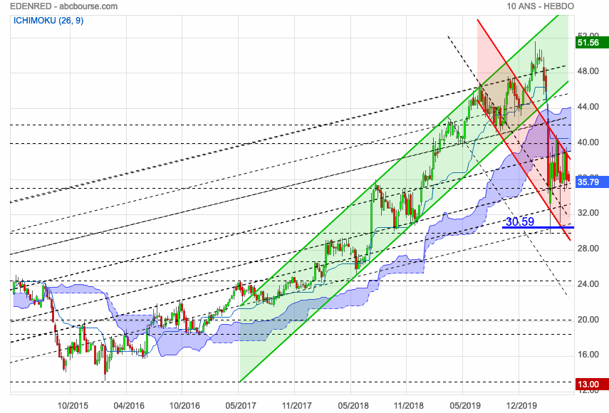 En gros, j'en conclus que la tendance haussière a été rompue et qu'on peut observer un 1er support situé à 30.59 dans ce nouveau canal baissier.
