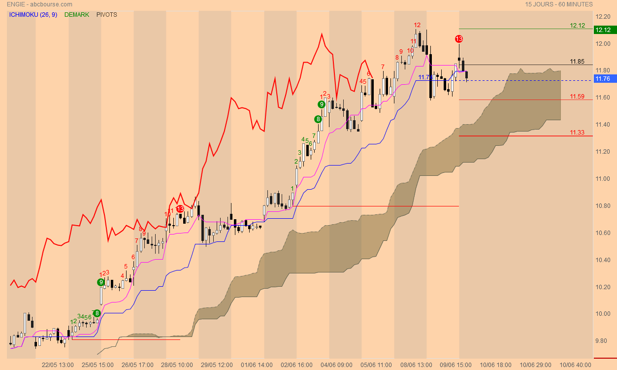 En 15 mn c'est mal engagé mais en H1 il restait encore une chance tant que 11,74 n'était pas enfoncé en clôture, la Chikou est toujours au dessus des bougies...
