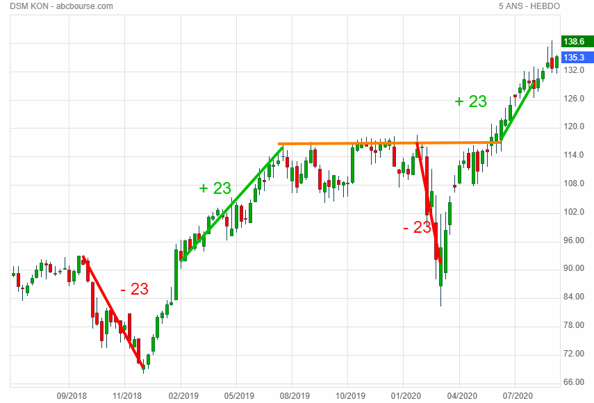bon, la ligne rouge á gauche symbolise une baisse de 23 euro de 93 á 70 ; la ligne verte á gauche