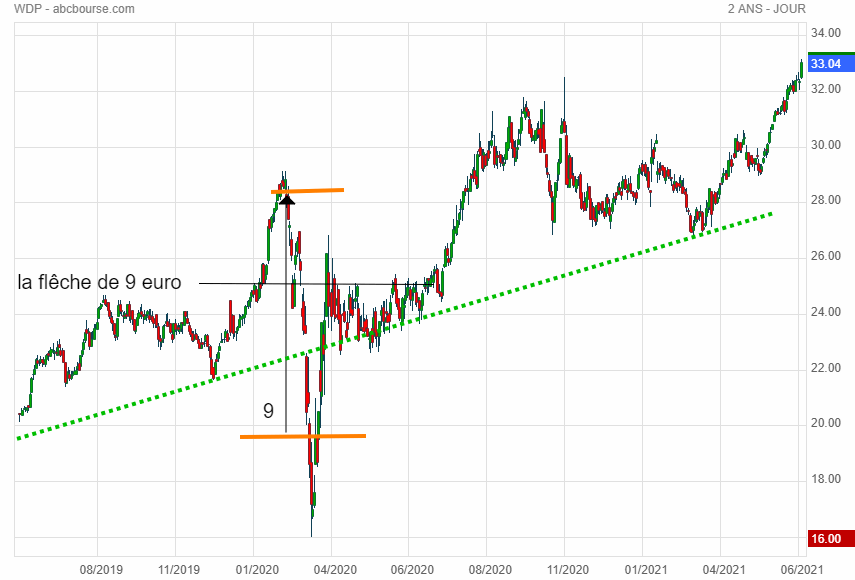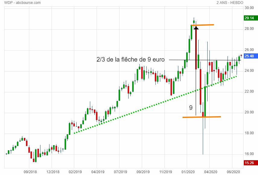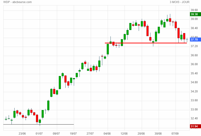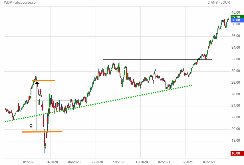 graph hebdomadaire sur le titre WDP : construction et management des infrastructures commerciales.