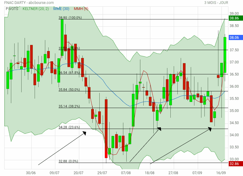 * Fnac Darty s'offre une cinquième séance de nette progression en cette fin de semaine, avec un titre en hausse de 2,2% à 38,6 euros.