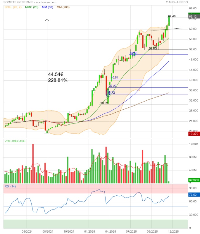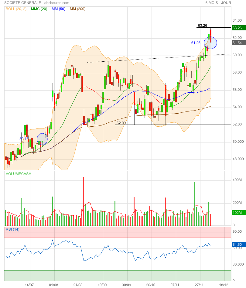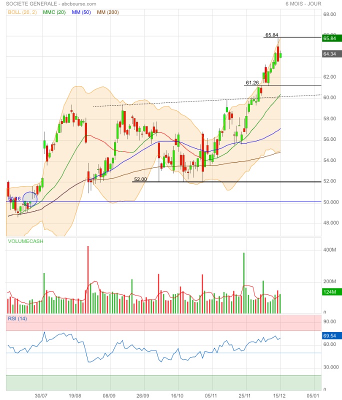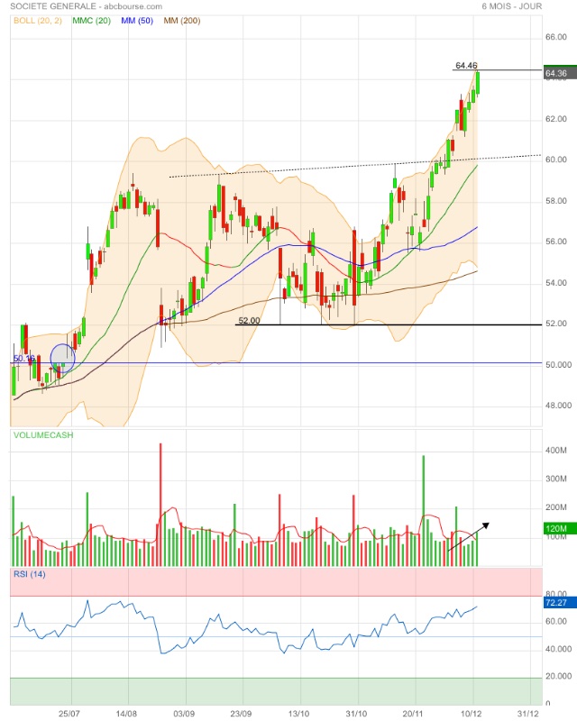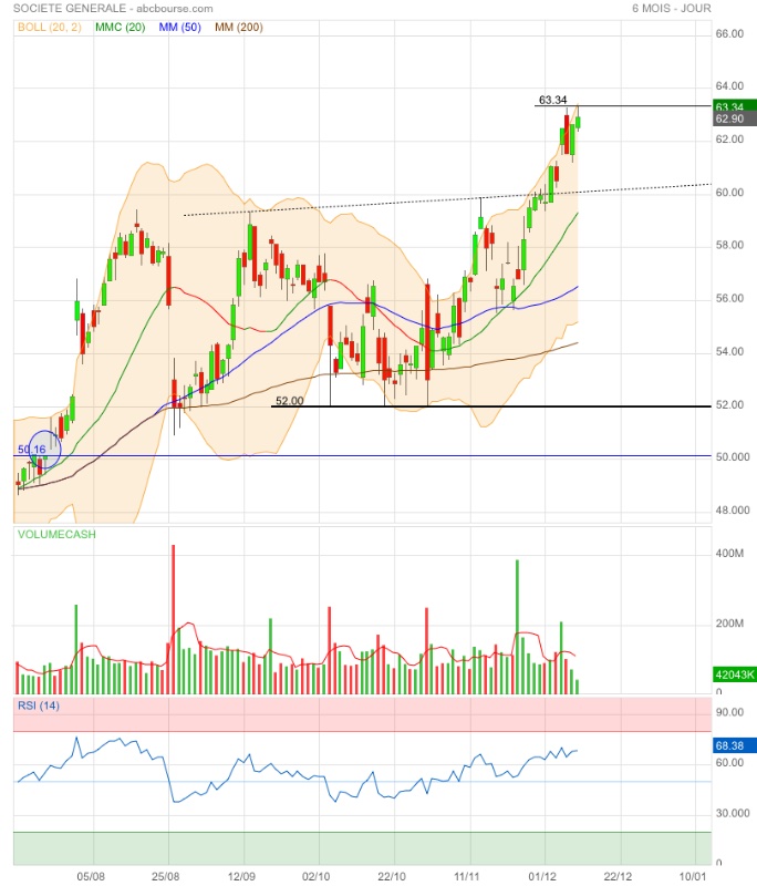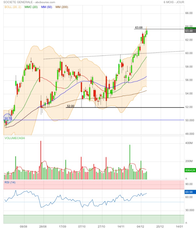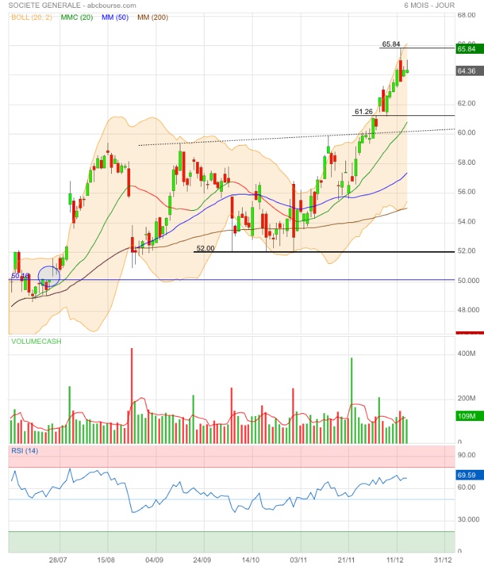 (AOF) - Société Générale (+3,54, à 66,64 euros) se distingue en tête de l’indice CAC 40 et pourrait enchaîner une troisième séance consécutive de progression. Le titre est soutenu par l’avis de Bank of America qui l’a intégré dans sa liste "Europe 1" de ses meilleures convictions et fait partie des "25 valeurs pour 2026" de la banque américaine.