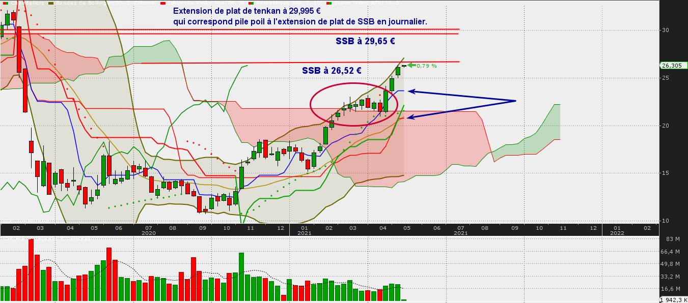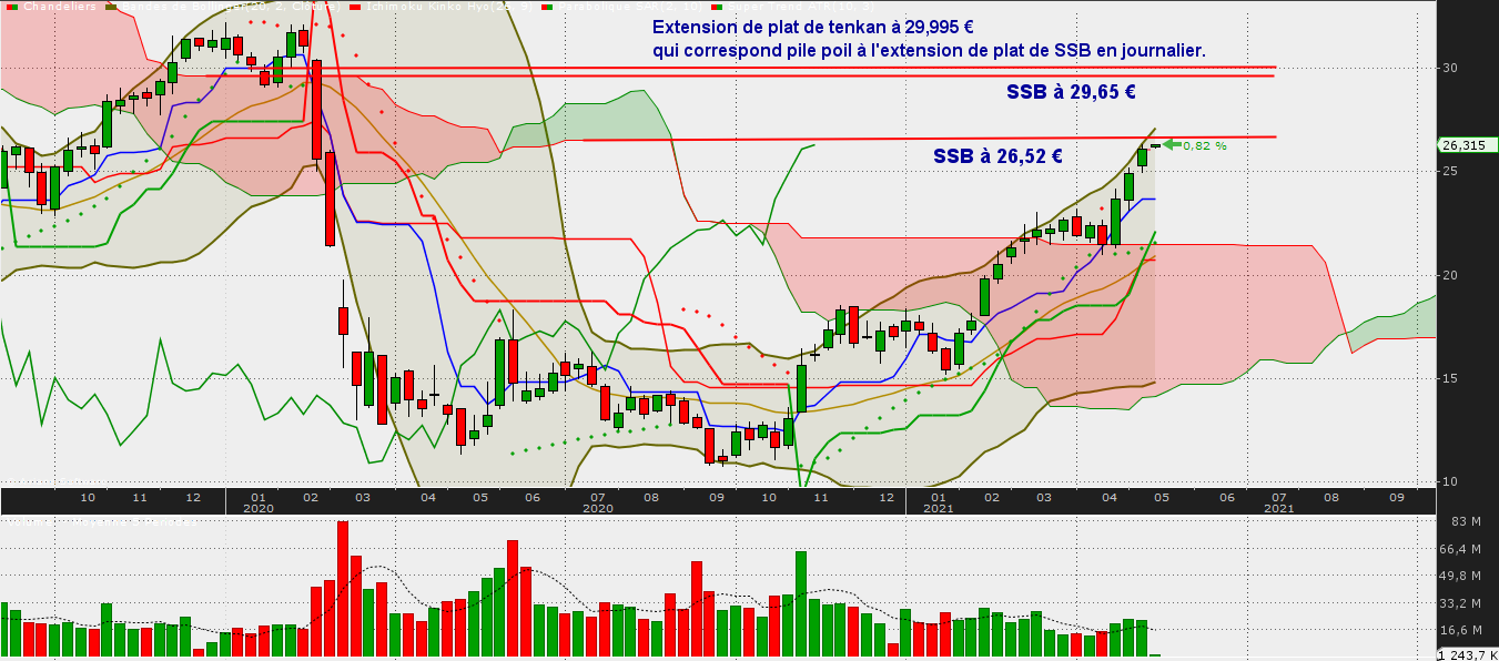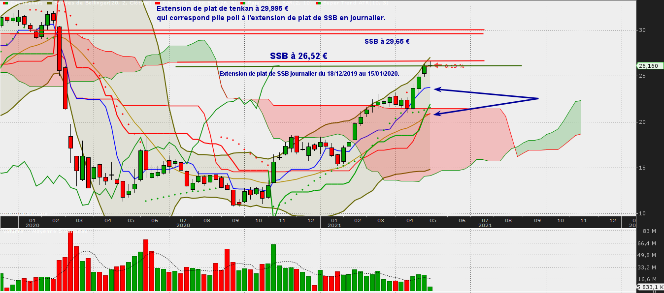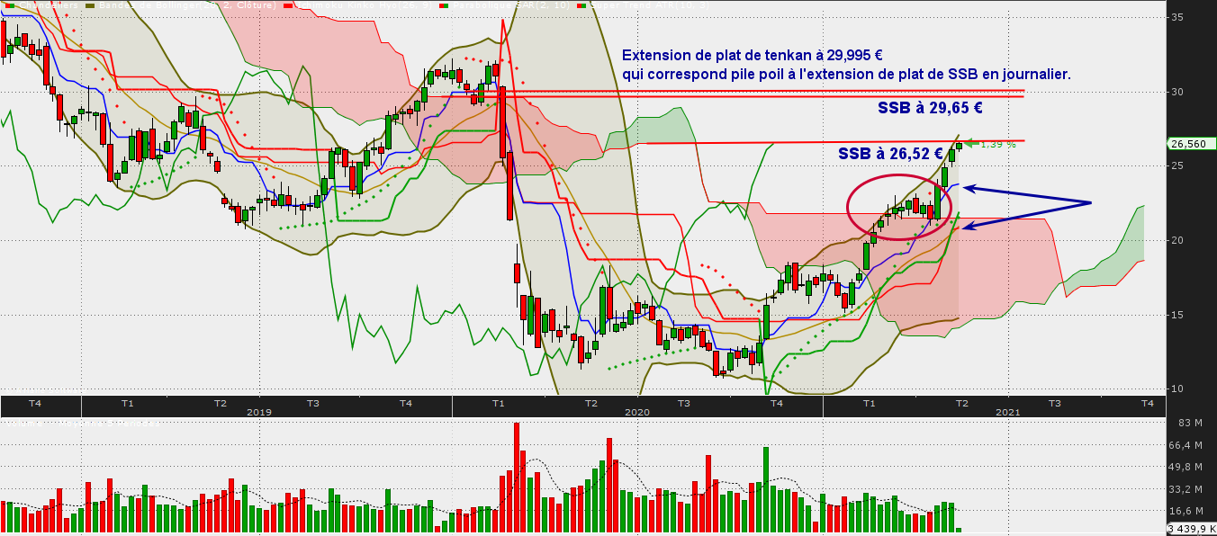 Kijun trimestrielle à 27,08 €. Notons, c'est intéressant que ce niveau des 27,08 € c'est aussi une extension de plat de kijun en journalier du 17/11/2019 au 29/11/2019. Ce niveau n'est donc pas fortuit.