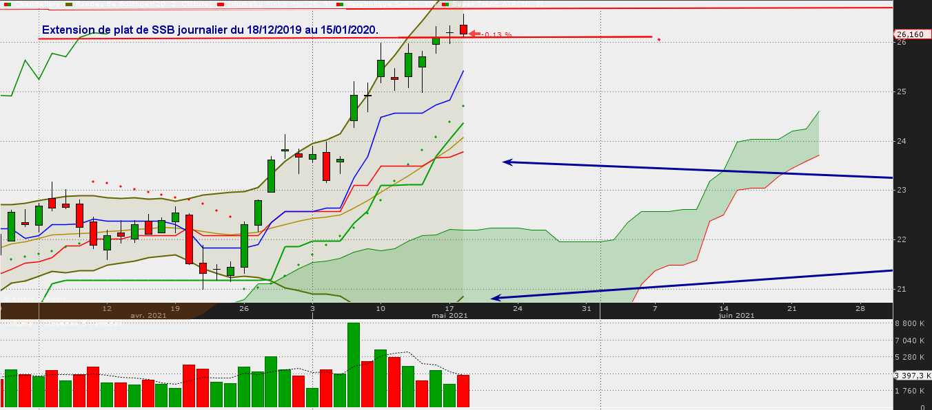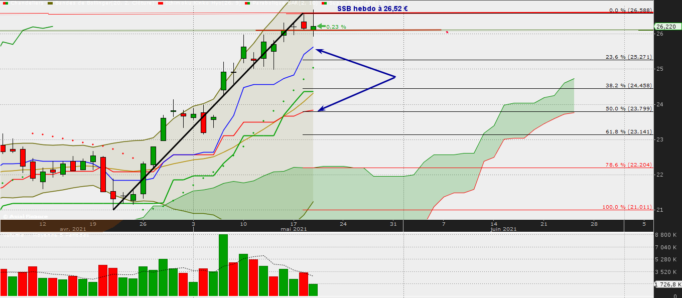On a buté ce jour la résistance hebdo : extension de plat de SSB hebdo à 26,52 € avec un plus haut à 26,575 € Rejet, et on revient clôturer sur les 26,160 €.