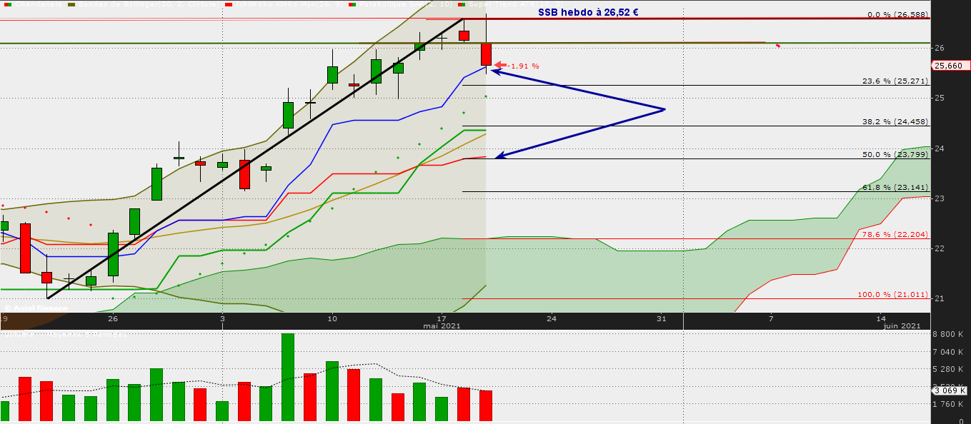 La résistance des 26,52 € en hebdo ( Extension de plat de SSB hebdo ) rejette encore les cours, ne validant pas, amha, le franchissement des 26,10 €.