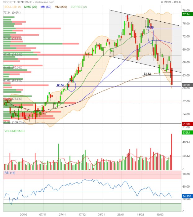 Hier, tests du bas de canal et du 50% Fibo (percés mais pas coulés) avec fermeture du gap 64,36€ s’il vous plait et, aujourd’hui, ouverture d’un nouveau gap d’ouverture 65,57€ pour finir par un (quasi) doji d’indécision 😳