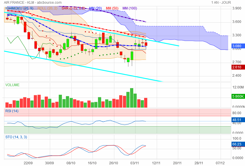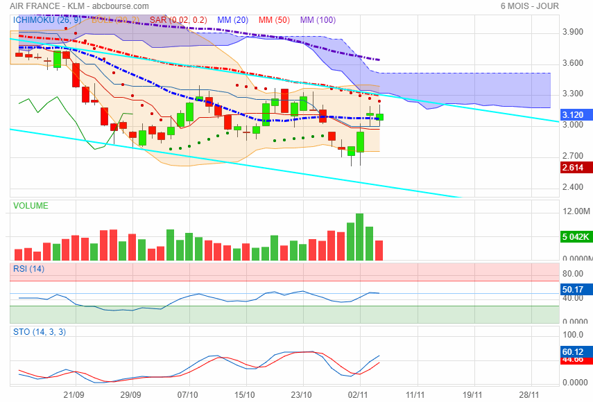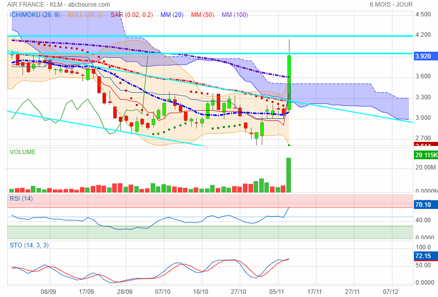 AF se maintient beaucoup mieux que se que j'avais envisagé (position en VAD pour moi), la STO semble vouloir croiser lundi et renvoyer le cours plus bas encore, RSI repasse en zone rouge.
