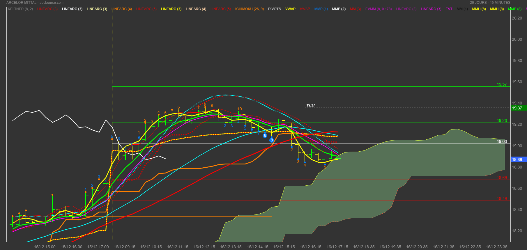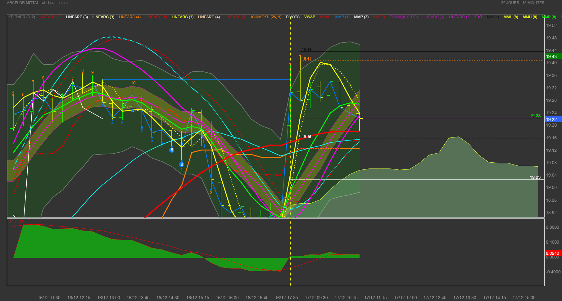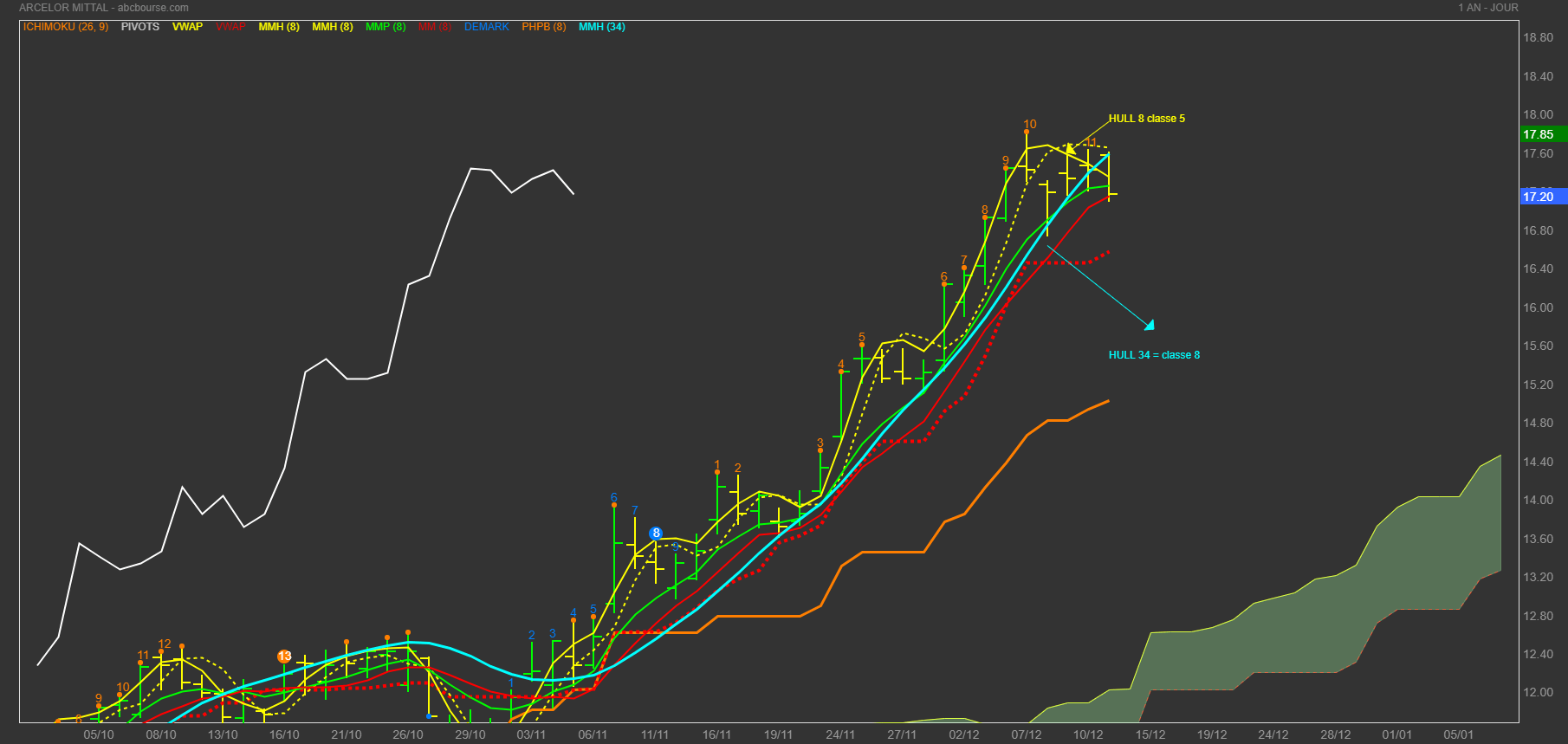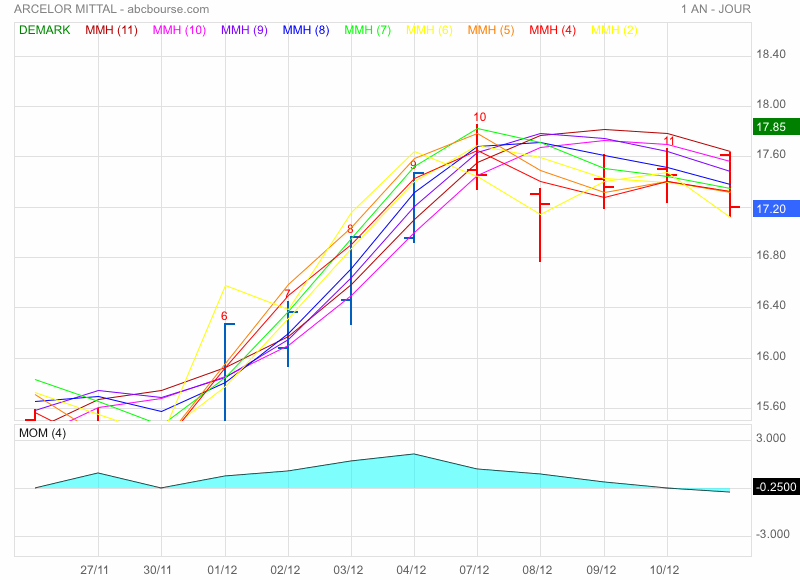 OR si j'applique cette logique à ARCELOR (mais avec n'importe quel support ça marchera). Je trouve (graphe suivra) le dernier point de countdown de valeur 11 et la moyenne de HULL 8 de classe 5 ,elle est dessous le countdown 11. En plus, si je calcule en % cela me fait 100 / 11 * 5 = 45,45 % en harmonie avec la volatilité du jour. et bien sûr de 1 MN à DAY ça marchera pour trader etc...
