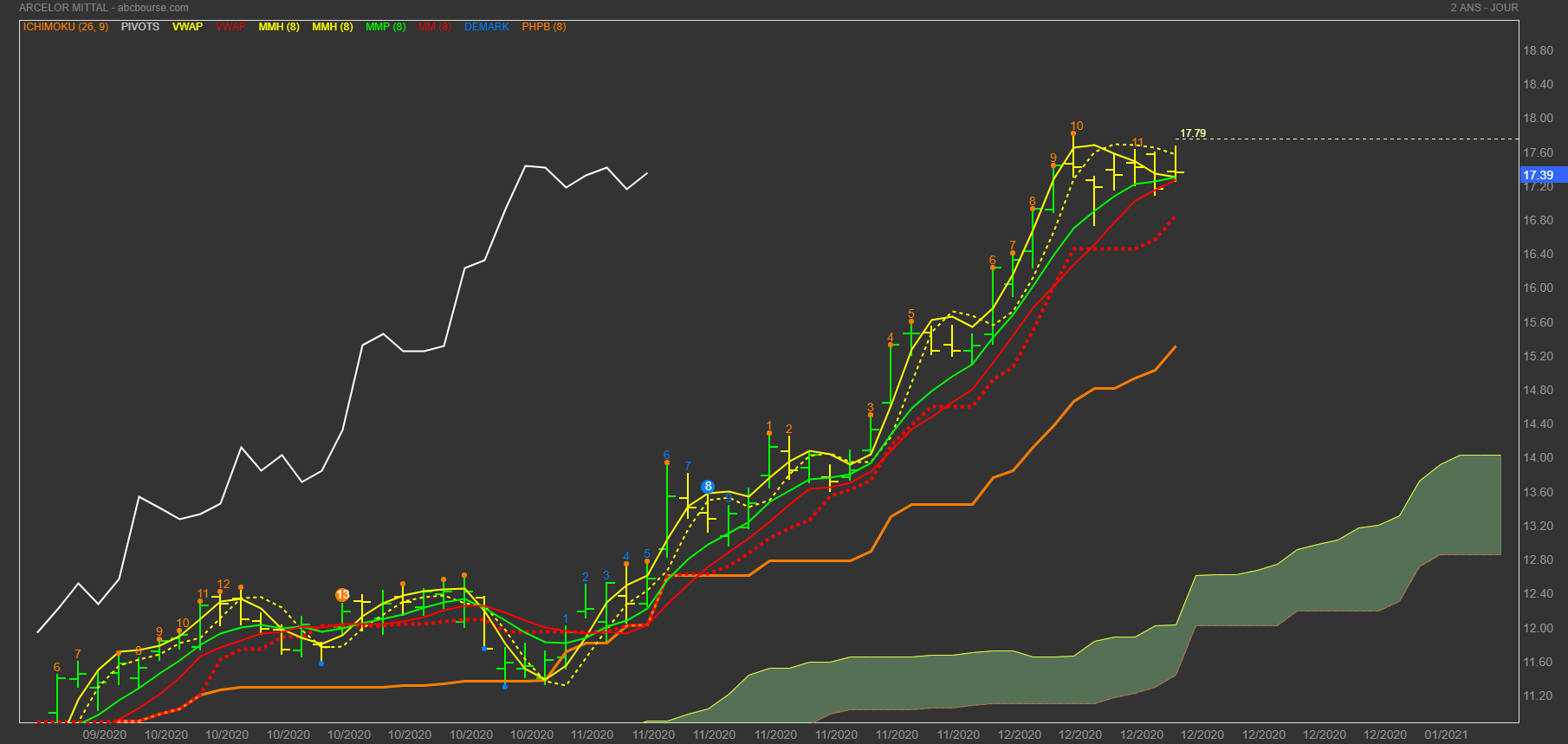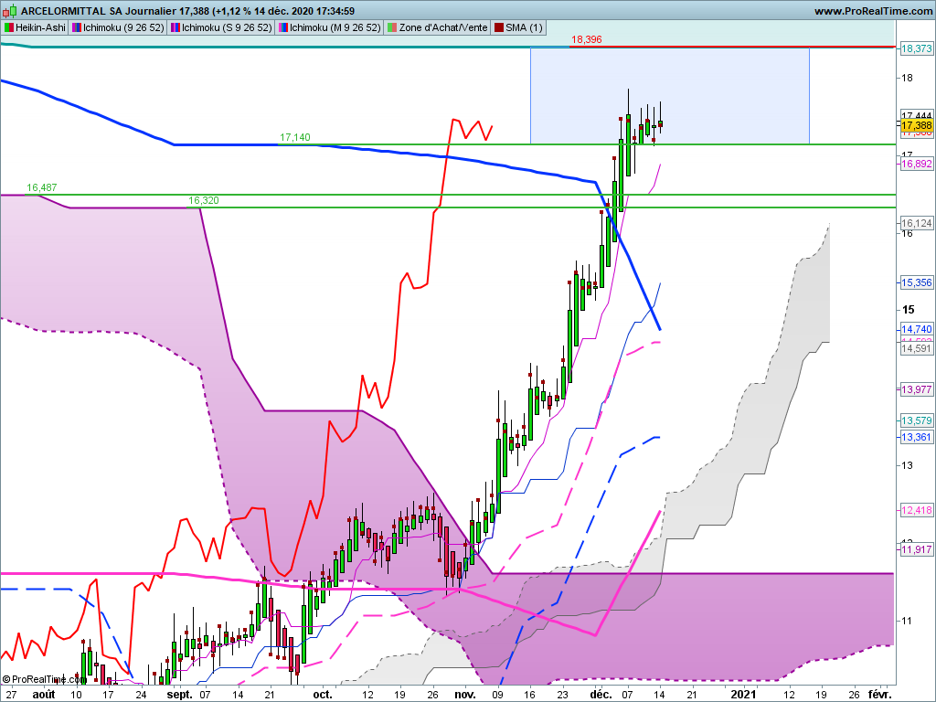 ARCELOR: la hausse ralentit et la tenkan est à 16,89, donc un peu loin pour pousser les cours vers le dernier plus haut de 17,85