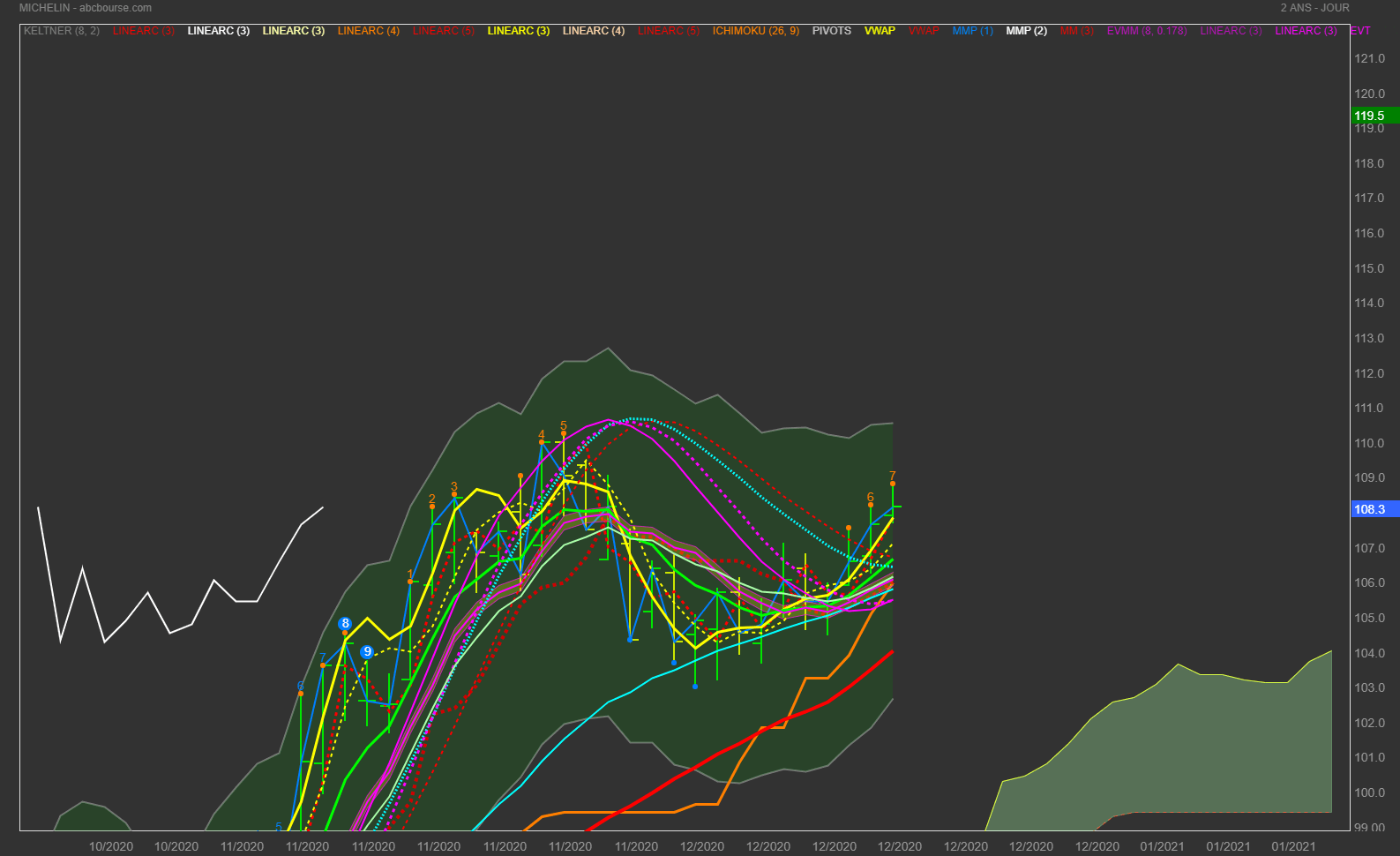 MICHELIN 108,15: OBJECTIF atteignable 110 voire 111 d'autant qu'en weekly l'action inscrit ce jour un CD 2