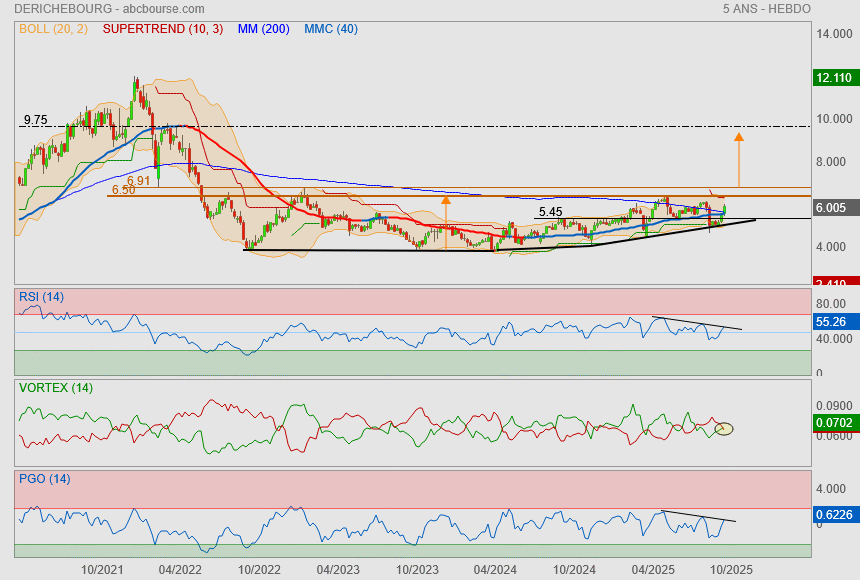 Toutefois, cette progression rapide place l'action dans une zone de surachat marquée. L'indice de force relative, ou RSI, atteint 86, un niveau largement supérieur au seuil de 70 généralement considéré comme révélateur d'une surchauffe technique. Ce positionnement suggère que le titre pourrait connaître une phase de consolidation à court terme, d'autant que les indicateurs stochastiques émettent déjà un signal de vente. Le cours évolue par ailleurs au-dessus de la borne supérieure de ses bandes de Bollinger fixée à 5,88 euros, ce qui renforce l'idée d'une extension temporaire du mouvement haussier. Avec un bêta de 0,12, Derichebourg affiche une sensibilité très faible aux variations du CAC 40, qui progresse de 0,28 % ce matin, témoignant d'une évolution largement décorrélée de l'indice parisien.