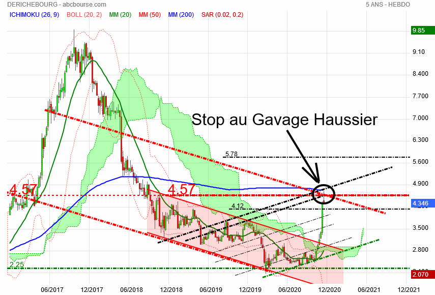 Si on enfonce les 5.78 qui est la médiane du canal de Donchian que vous ne connaissez pas alors le cours filera à 5.16 euros comblé le deuxième gap haussier . Conclusion : tout porte à croire que le gavage haussier a trouvé ses limites dont j' ai décris les niveaux de résistance .