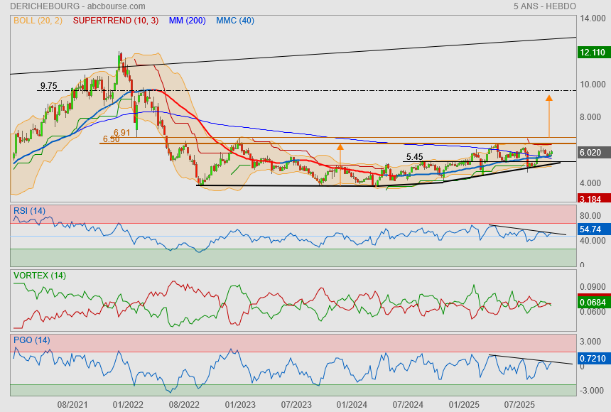 Toutefois, cette progression rapide place l'action dans une zone de surachat marquée. L'indice de force relative, ou RSI, atteint 86, un niveau largement supérieur au seuil de 70 généralement considéré comme révélateur d'une surchauffe technique. Ce positionnement suggère que le titre pourrait connaître une phase de consolidation à court terme, d'autant que les indicateurs stochastiques émettent déjà un signal de vente. Le cours évolue par ailleurs au-dessus de la borne supérieure de ses bandes de Bollinger fixée à 5,88 euros, ce qui renforce l'idée d'une extension temporaire du mouvement haussier. Avec un bêta de 0,12, Derichebourg affiche une sensibilité très faible aux variations du CAC 40, qui progresse de 0,28 % ce matin, témoignant d'une évolution largement décorrélée de l'indice parisien.