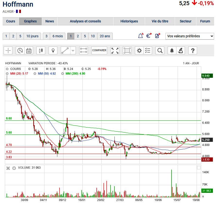 A la suite de sa publication avancée au 3 Septembre Hoffmann annonce un renforcement de ses ressources financières qui va diluer un peu plus les actionnaires. D'où la forte baisse du titre sur les 4,14 euros pas très loin de ses plus bas.