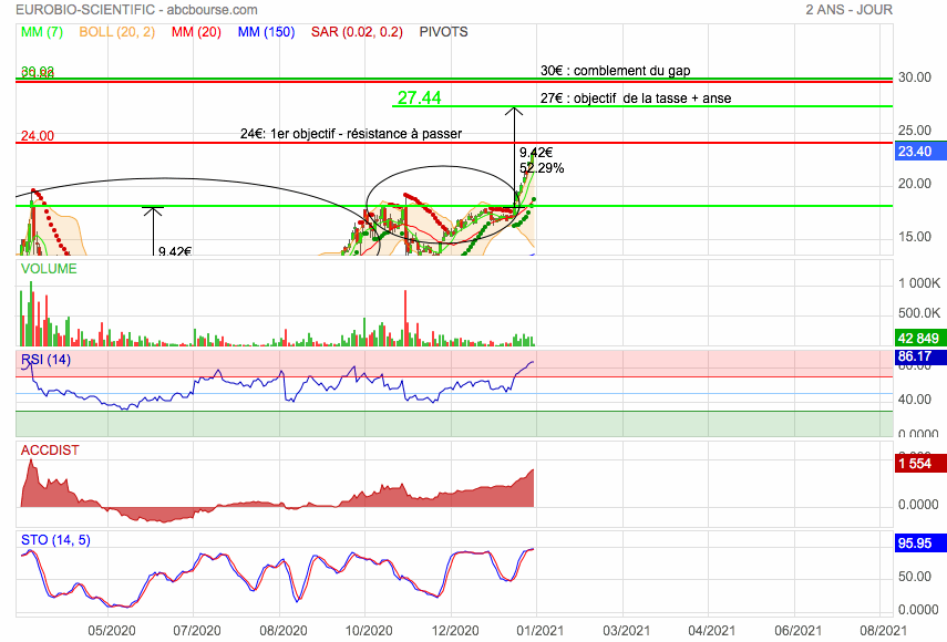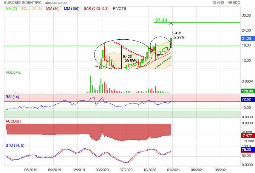 Novacyt c'est bien mais Eurobio c'est pas mal non plus. Je peux me tromper mais en 1er objectif 27 € serait pas mail. Ca laisse de laisse la marge.