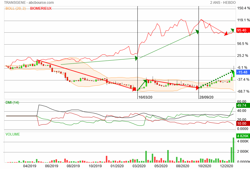 AT "fi de l'actu":en ôtant un peu de bruit(2ans/hebdo) transgène et biomérieux s'accordent mi-janvier ce que confirme la DMI:prémisses d'un rallye?en mars TNG a manqué de punch pour poursuivre ses amorces de hausses malgré des interventions régulières en terme de volumes,ceux-ci ayant tout de même permis de rester dans la course