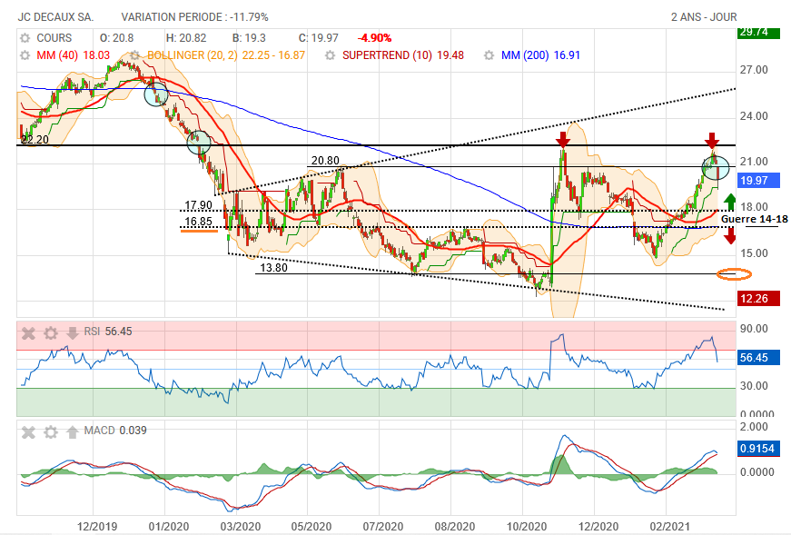 Trimestre. L'effet de base sera toujours très difficile sur le premier trimestre 2021 avec une pandémie qui continue de sévir. En conséquence, le chiffre d'affaires est anticipé à -40% sur la période. Mais un fort rebond est prévu par la suite avec un retour progressif à la normale du business... Nous pourrions choisir de prendre des profits après avoir acheté le titre JCDecaux sur les 16 Euros en janvier dernier. Mais l'approche de la sortie de crise ne devrait plus conduire l'action de l'afficheur à revenir sensiblement en arrière. Au fil du temps, les investisseurs vont plutôt avoir tendance à se replacer sur ce genre de dossier. Nous sommes donc conduits à maintenir une préconisation positive sur JCDecaux qui se situait, faut-il le rappeler, sur les 30 Euros fin 2018...