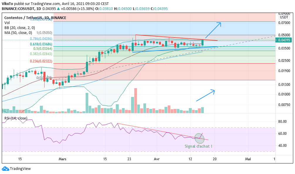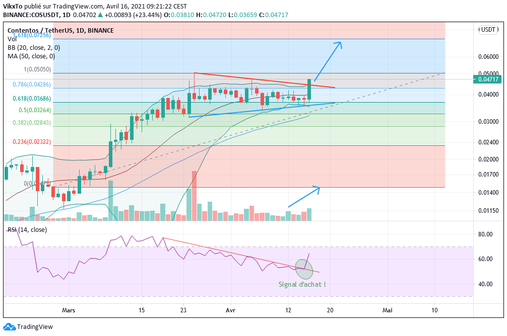 Sortie de triangle en cours sur le COS (Contentos), on vient casser la divergence baissière sur RSI.