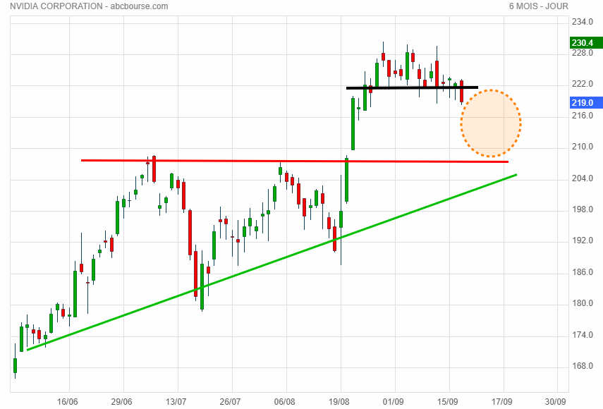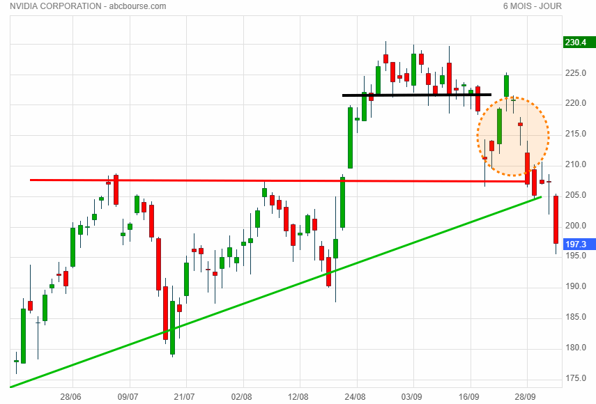 ne pas bien pour les haussiers : le zone orange perdu implique des cours < 205.