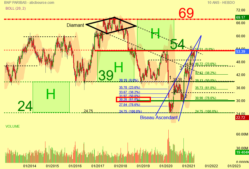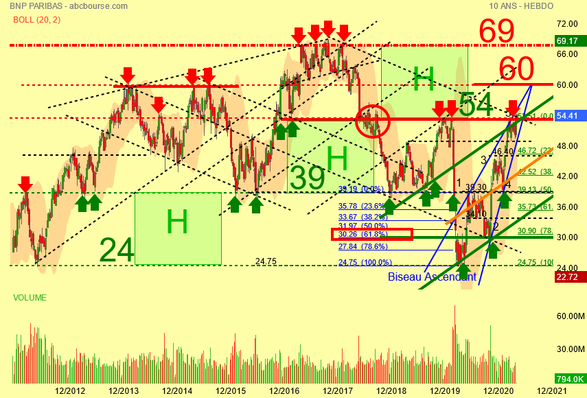 Nouveau plus haut à 54.58 euros mais absolument aucun volume , le cours rebondit depuis le 16 mai 2020 date de son dernier plus bas dans un biseau ascendant , l' évolution des volumes dans ce type de figure chartiste montre que les acheteurs se portent de moins en moins acquéreurs de l' action dont le risque de chute est réel surtout après de très bons résultats publiés.