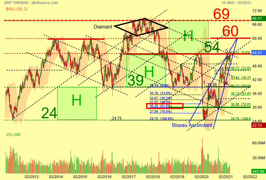 On y rajoute la sauce du BISEAU ASCENDANT BLEU , des volumes en baisse dans le BISEAU en prime le décompte des vagues d' elliott et mise en place des retracements de Fibonacci .