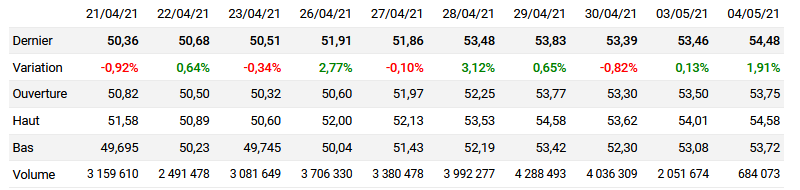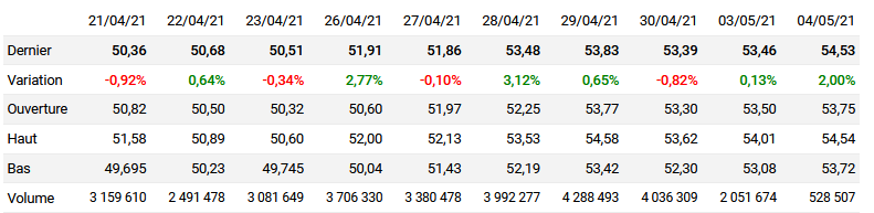 Tableau des 10 derniers jours de cotation :