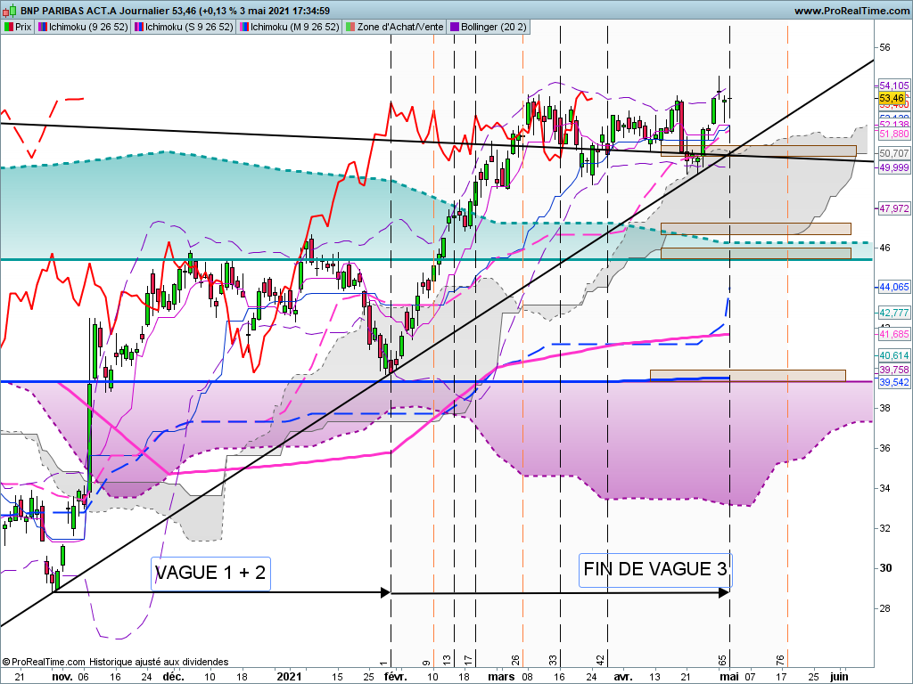 On notera le point haut à 54.58 euros du 29 avril que l' on comparera au point haut actuel de ce 4 mai à 54.55 euros , juste pour vous le signaler pour la suite. Il aura peut être son importance !