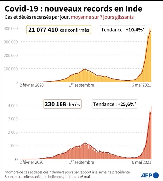 Et ce à un moment où l'Inde subit toujours une mortalité et une contagion record: 3.980 morts et 412.262 contaminations supplémentaires jeudi, avec un bilan total, que les experts jugent largement sous-évalué, de plus de 230.000 morts et 21 millions de cas.