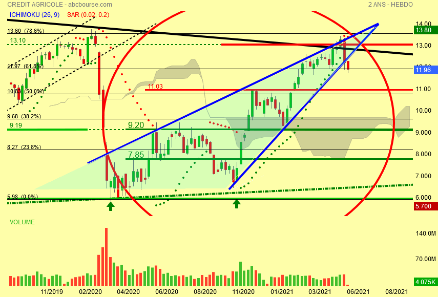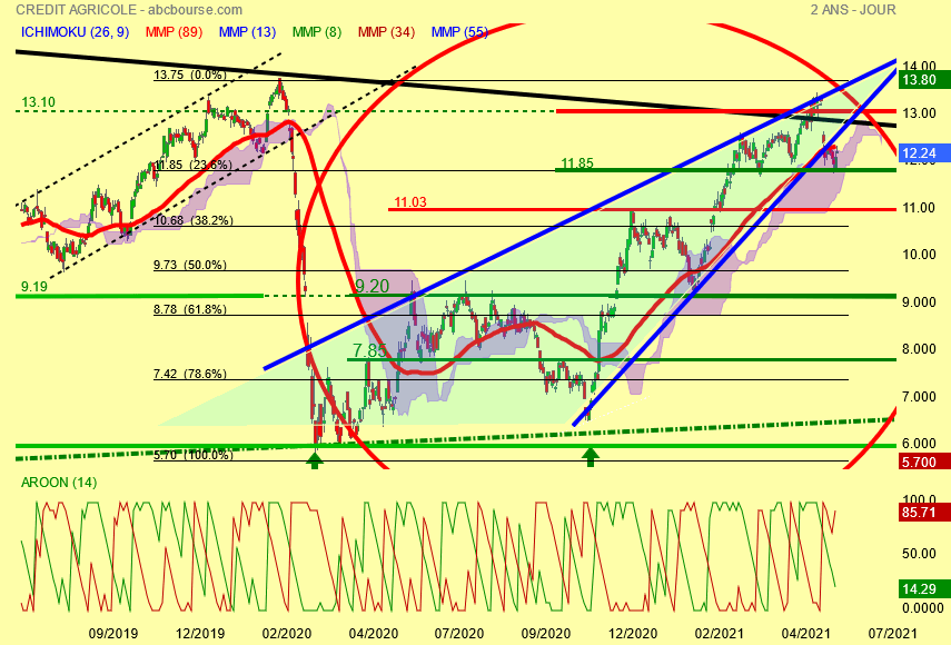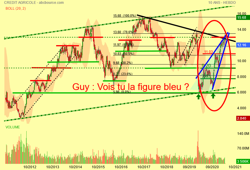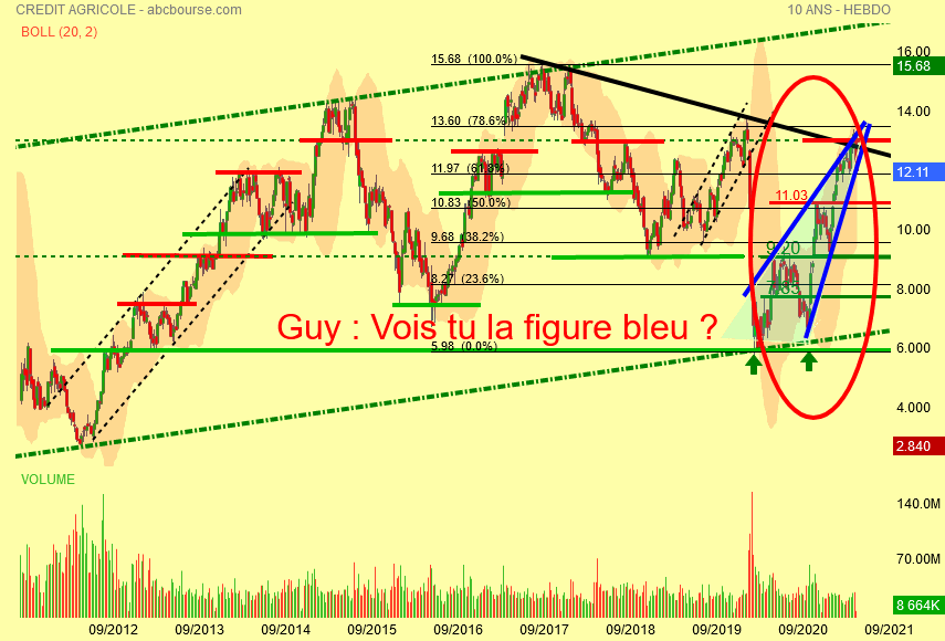 11.85 Euros soit le fibo des 23.6 % permet au cours de rebondir çà va beaucoup mieux mais on dirait que la MMP89 rouge est résistance actuelle , l' étau baissier se desserre quelque peu en principe on repart à la hausse , faudra attendre la confirmation .