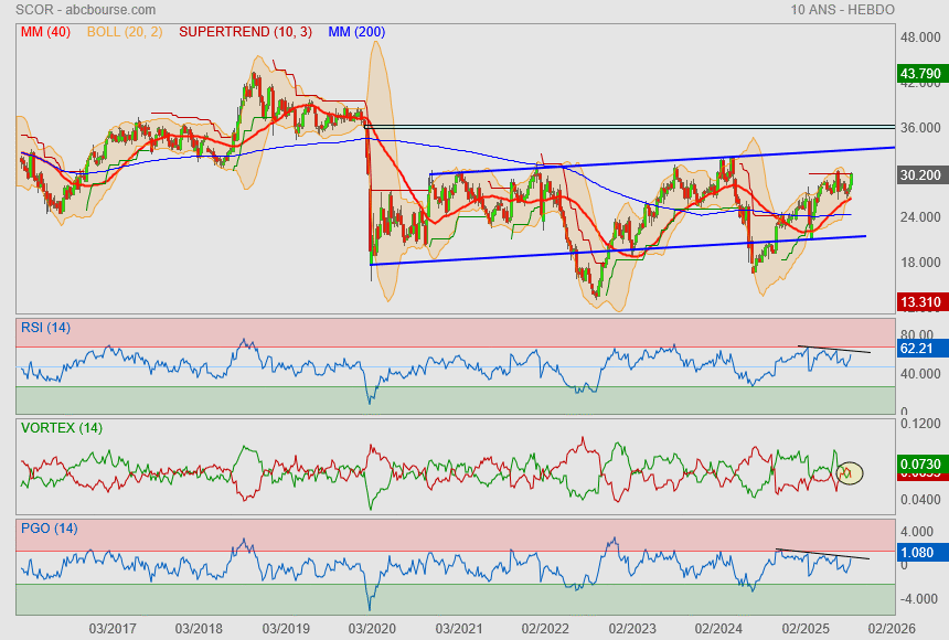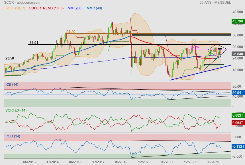 Lors des renouvellements de juin-juillet 2025, Scor avait poursuivi la croissance de ses lignes cibles et diversifiantes, tout en maintenant une politique de souscription disciplinée dans un environnement concurrentiel. À l'avenir, le groupe s'attend à ce que la surcapacité perdure dans le segment de la réassurance, ce qui devrait avoir un impact sur les prix. Scor reste toutefois déterminé à profiter des opportunités commerciales attrayantes, à maintenir une politique de souscription stricte, et est prêt à redéployer son capital ou réduire sa capacité si nécessaire pour atteindre son taux de rendement exigé... Le groupe publiera le 31 octobre prochain ses résultats du T3 2025.