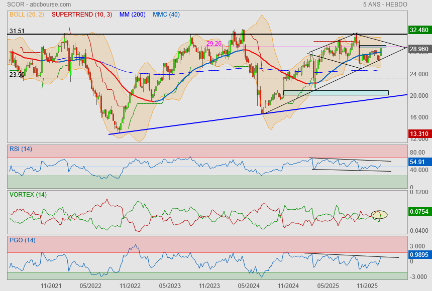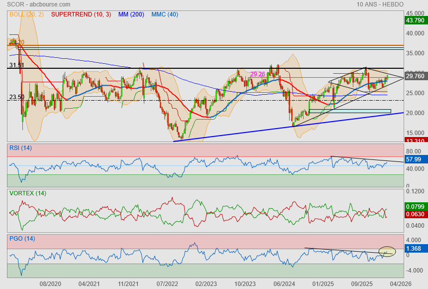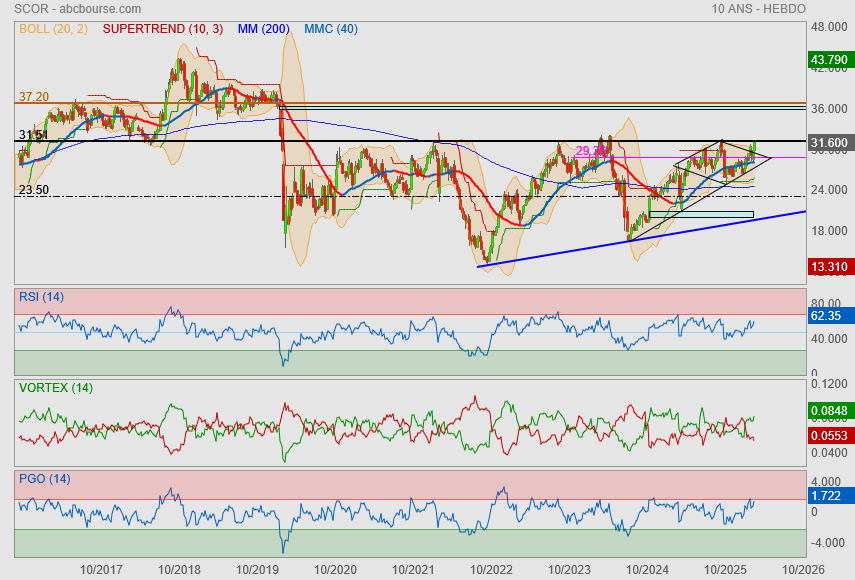 Rendement. Le rendement est également attractif. Alors que le coupon fixé au titre de l'exercice 2024 était de 1,8 Euro, la rémunération atteint 6,8%... Sur le fond, on constate aussi que Scor parvient désormais à limiter l'impact des catastrophes naturelles sur ses comptes. Par ailleurs, la composante spéculative n'a probablement pas disparu. On se souvient que l'assureur mutualiste Covea avait cherché à prendre le contrôle de la société en 2018 mais que le patron de l'époque Denis Kessler était parvenu à repousser l'assaillant. A l'époque, Covea était prêt à offrir 43 Euros par action Scor...