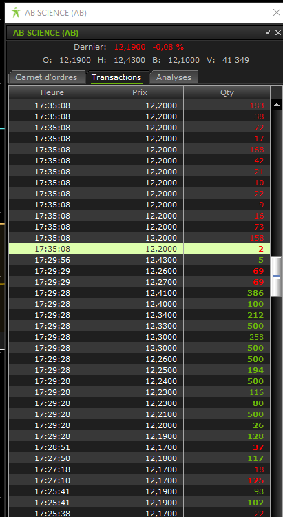 suspens à la clôture.. car hier à 17h30 pile le titre prenait 2.30% en hausse MAIS au fixing 17h 35mn 08s , 14 fois petits ordres de ventes à 12.2.€ soit baisse de 2.14%..