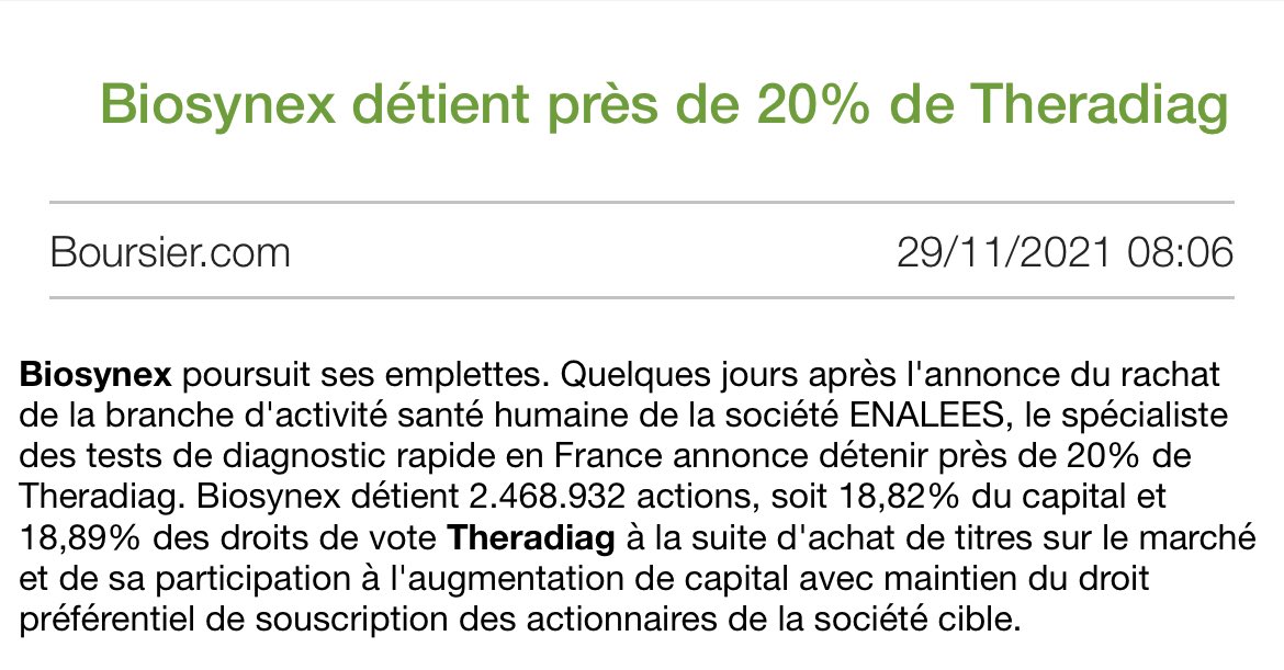 Pour Biosynex, c’est une bonne affaire, la boite achète le potentiel et les perspectives de theradiag. Si in fine OPA, on sera sur du 3€. Pour ma part il y de la marge.