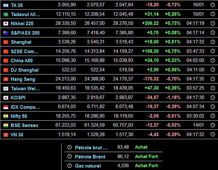 Paris, (a w p/a f p) - 17/01/2022 | 18:59 ►Les bourses européennes rebondissent grâce à la Chine, sans Wall Street