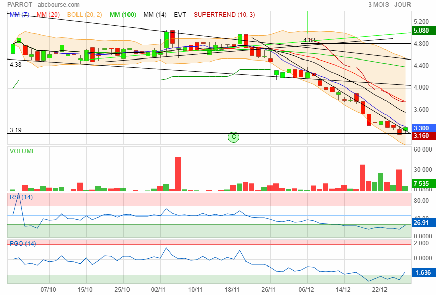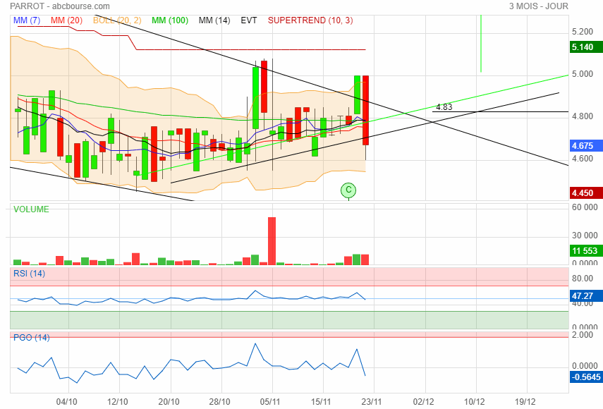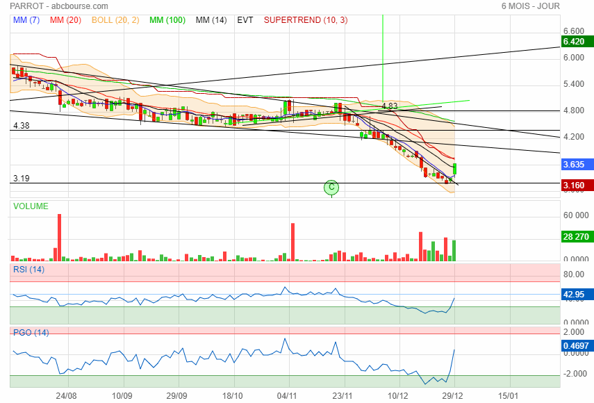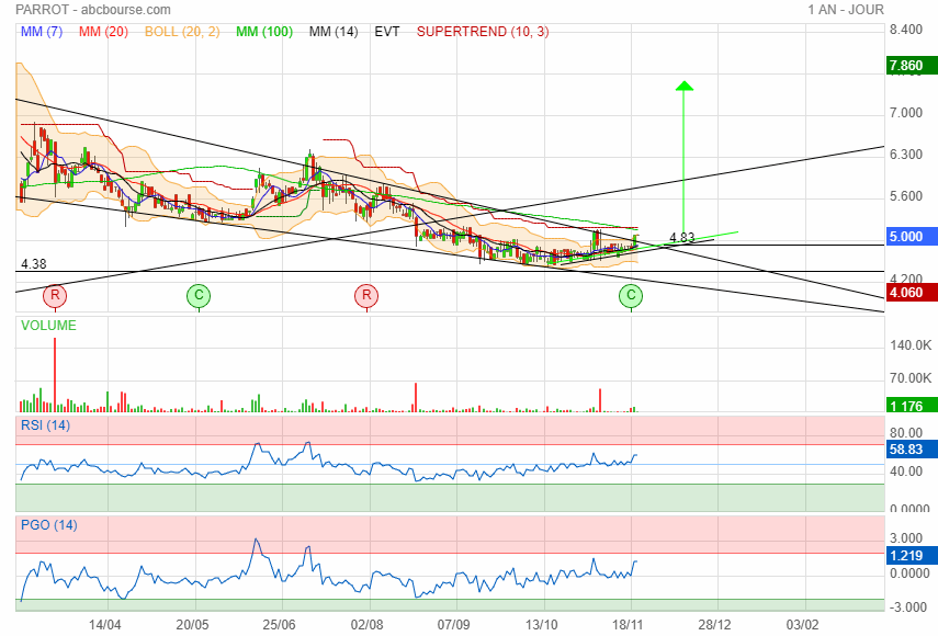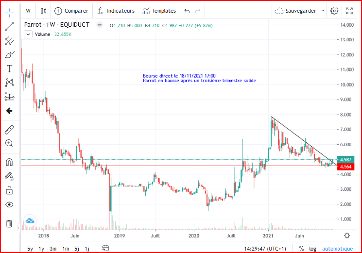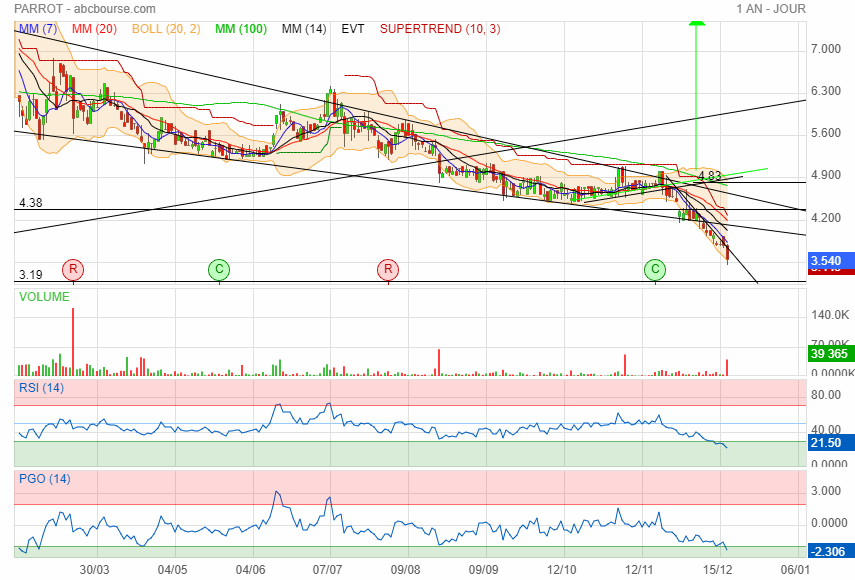 Capitalisation. Dans les cours actuels, la capitalisation est de 105 Millions d'Euros. Au vu des cessions intervenues dernièrement, la trésorerie nette ne doit pas être très éloignée de ce montant... Investir sur Parrot continue de comporter une bonne part de risque alors que les résultats sont encore loin d'être satisfaisants. Nous envisageons néanmoins l'avenir de cette valeur avec une certaine confiance. A l'approche de la fin 2021, il est possible que certains gérants soient en train de solder leur ligne Parrot afin qu'elle n'apparaisse plus dans les reportings de décembre. Ces dégagements permettent d'entrer sur le concepteur de drones à un prix attractif. Pour les amateurs de valeurs en retournement, Parrot nous apparaît comme un titre à retenir... audacieux mais à fort potentiel.