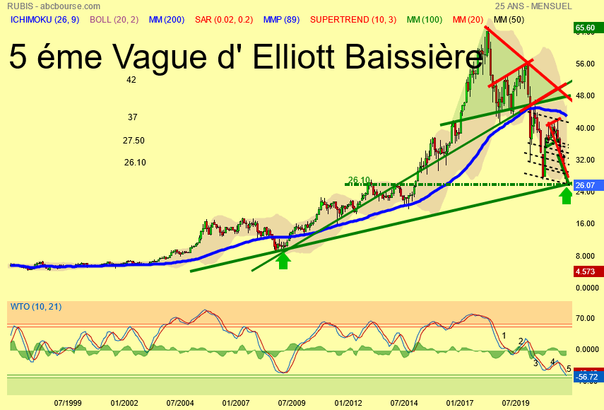Nous sommes dans la 5 éme vague d' Elliott baissière c' est l' ultime vague d' épuisement de la tendance . L' indicateur WTO présente le décompte des vagues , nous sommes au niveau du plus bas de 2009 .