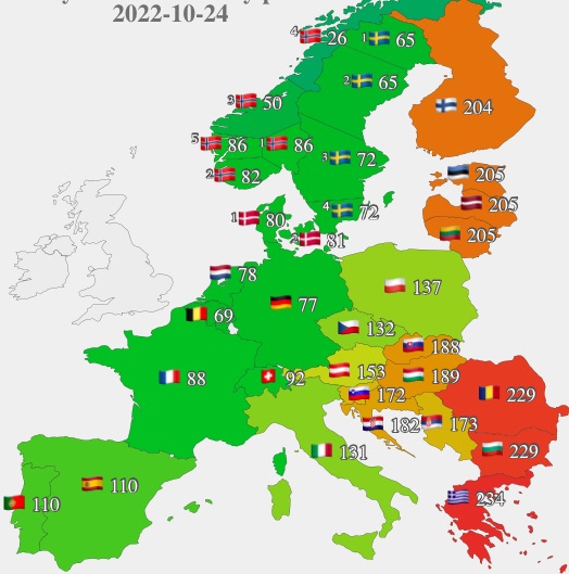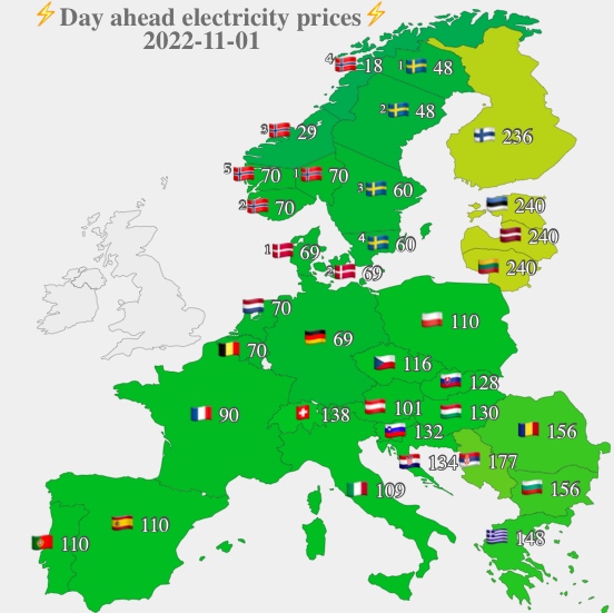 Jusqu'à 13 GW de production éolienne et de 8 à 10 GW d'exportation toute la nuit dernière (23-24/10). Entre 15 et 27% de production éolienne en continu sur 2 jours ce qui a permis de ne pas utiliser fuel et charbon encore insignifiant en ce moment , de réduire le gaz aussi