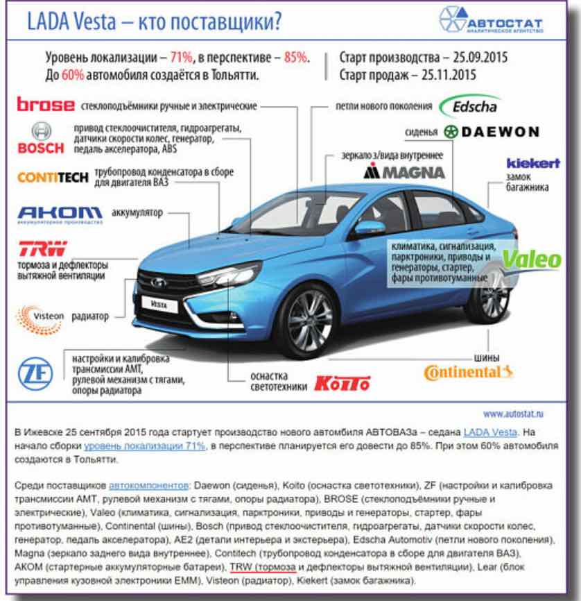 L'agence d'analyse AUTOSTAT a publié une infographie intitulée "LADA Vesta - Qui sont les fournisseurs ?". Il montre qu'au début de l'assemblage, la voiture était localisée à 71% et qu'à l'avenir, ils prévoient d'augmenter ce taux à 85%. En outre, 60 % des composants de Vesta sont fabriqués à Togliatti. Il est prévu d'étendre la localisation.