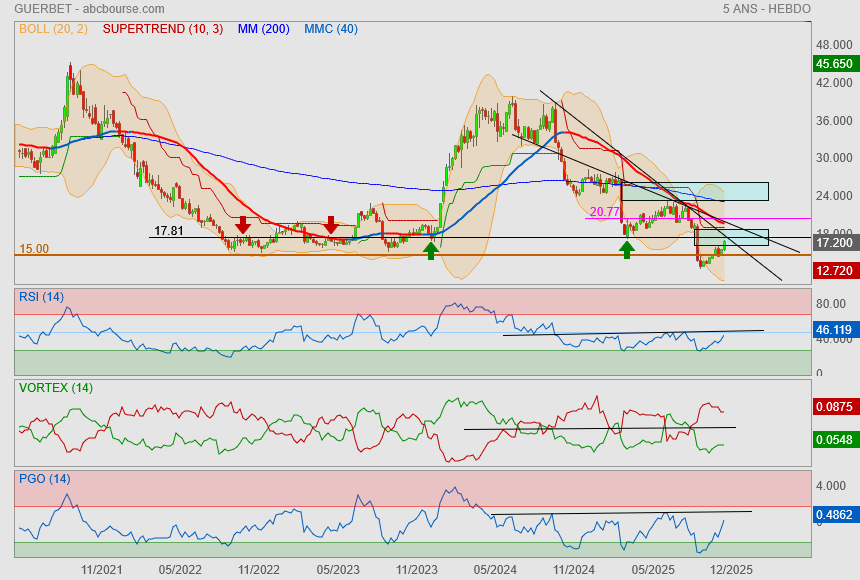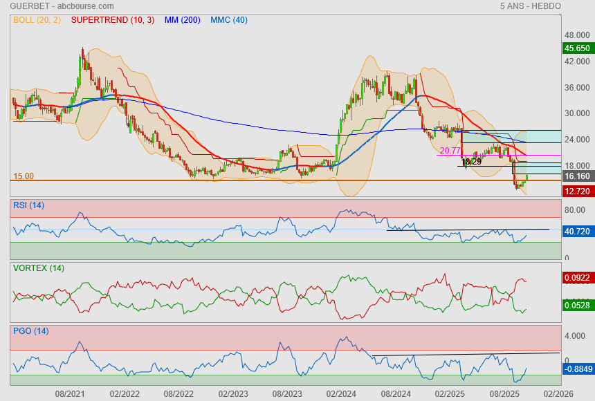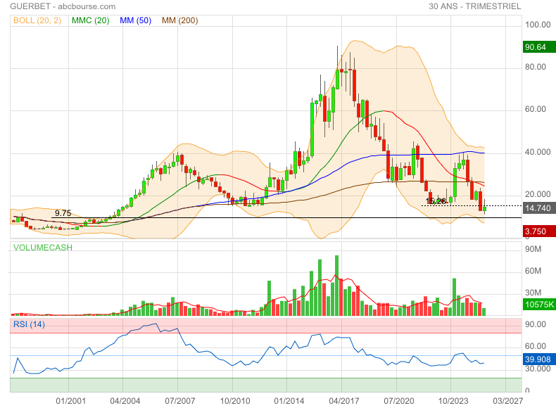 Dans ce contexte, Guerbet confirme l’ensemble des objectifs financiers annoncés le 15 septembre dernier. Le Groupe anticipe pour 2025 une légère décroissance de son chiffre d’affaires à TCC et périmètre comparable, autour de -1%, s’accompagnant d’un taux de marge d’EBITDA retraité dans une fourchette de 12 à 13%. Par ailleurs, le niveau de free cash-flow est toujours attendu légèrement négatif sur l’exercice.