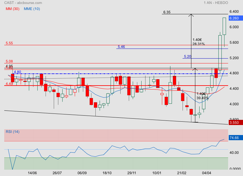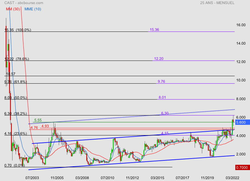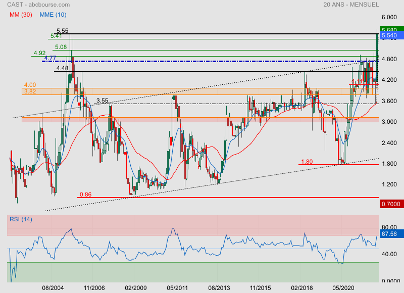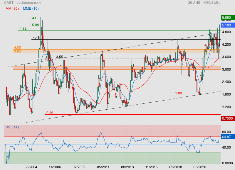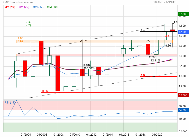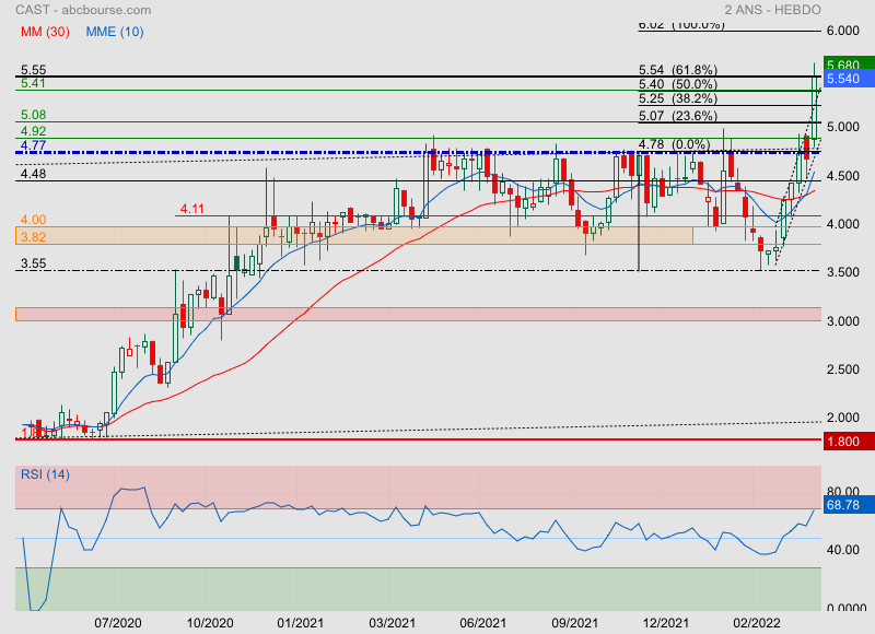 La feuille de route prévoit un doublement de la taille de l'entreprise au cours des cinq prochaines années. A échéance, la marge opérationnelle devrait se situer entre 15% et 20% alors qu'elle était de 11,4% l'an dernier... Alors que le titre Cast a bien réagi à la publication d'un résultat 2021 en forte hausse, il est train de reperdre du terrain à la suite d'un niveau d'activité jugé sans saveur sur les trois premiers mois de 2022. Cast a toutefois indiqué que cela ne remettait nullement en cause le scénario avancé pour 2022 et la suite... Un trimestre peut être pollué par des décalages sans conséquence pour la suite.