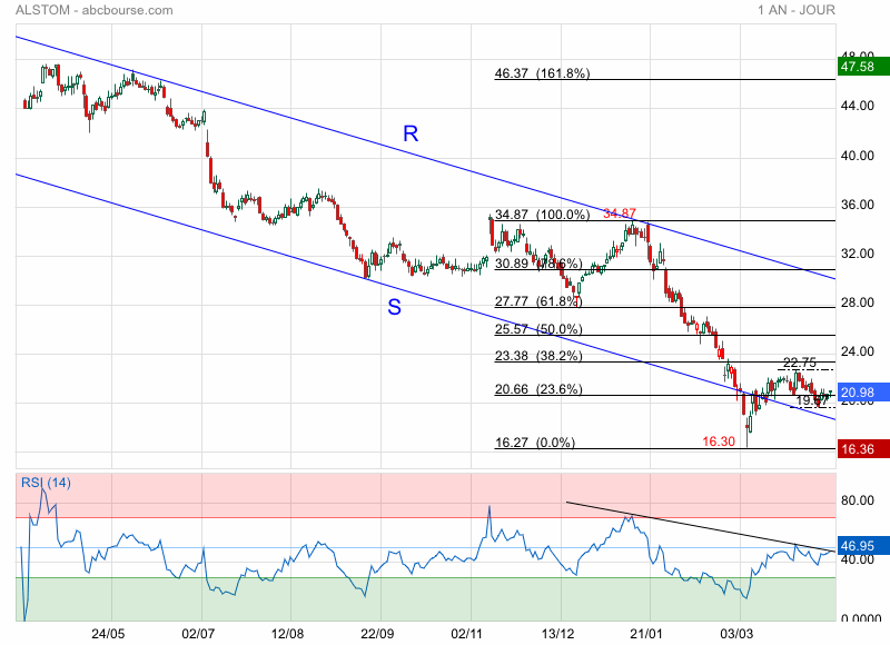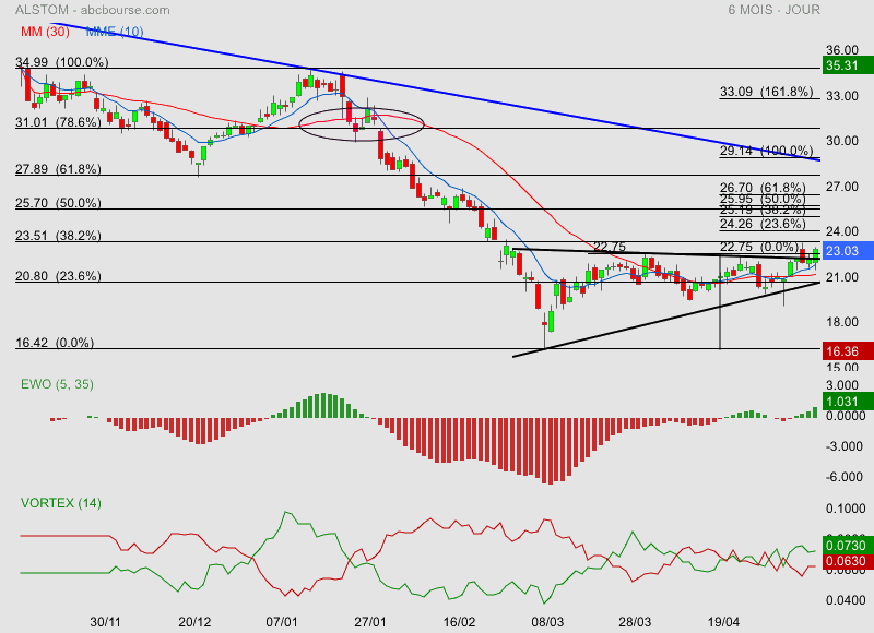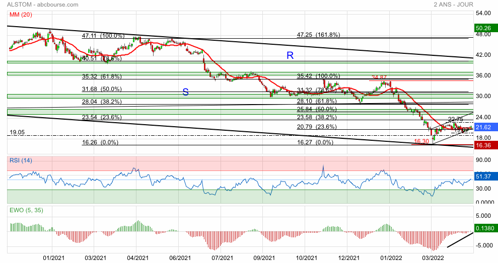 Les indicateurs s’améliorent. Le cours est au dessus de la mm20; le RSI sur le point de donner un signal, l’indicateur EWO qui était en décroissance sur le point de passer vert . Les ratios fibo s’alignent 16.30€ était peut être un point bas pour confirmer 23.58€