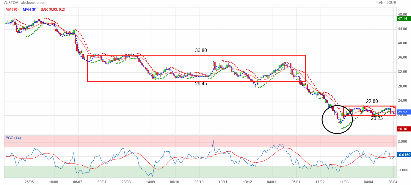 Chute de 60 % depuis 06/2021, puis palier entre 07/2021 et 01/2022 (rectangle de gauche – entrée par le haut, sortie par le bas), puis rechute (- 43% depuis le 01/2022). 03/022, entrée dans un nouveau rectangle (de gauche. Mais… entrée par le haut, ? ou par le bas ? Voir la bizarrerie dans le cercle noir.