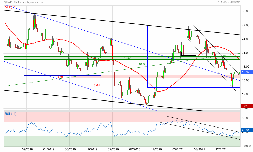 On note une symétrie sur la valeur et ces retracements ….. les indicateurs s’améliorent , au dessus de la zone rouge la tendance évite la pression baissière bien sur nous sommes encore sous la mm200 19.70€