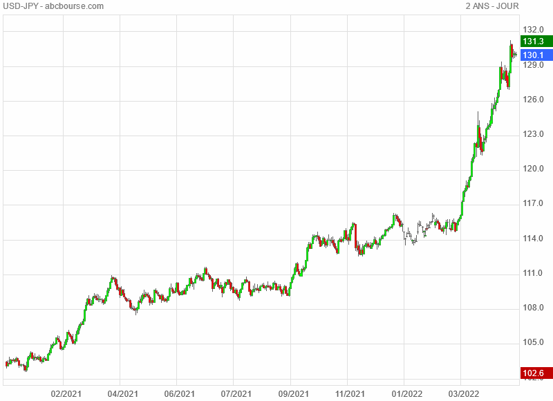 Exemple ci-dessous, nous avons l'USD-JPY. Alors certes je pourrais demander à ajouter le JPY-USD et dans ce cas j'aurai ma réponse mais l'intérêt pour moi est bien de conserver la vision USD-JPY tout en montrant que la monnaie japonaise coule. L'échelle inversée peut bien sûr être utile sur d'autres actifs. Ceci n'est qu'un exemple.