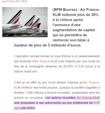 On peut lire dans la presse que Air France KLM propose aux actionnaires ses actions au taux préférentiel de 1.17 (du 27 mai au 9 juin 2022).