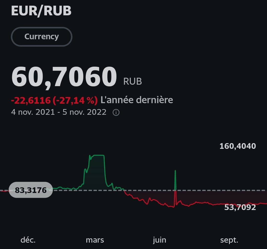 Sauf que le rouble est et reste à un niveau plus élevé (0.015$) qu'avant la guerre (0.013$), signe que l'économie ne se porte pas si mal que ça....