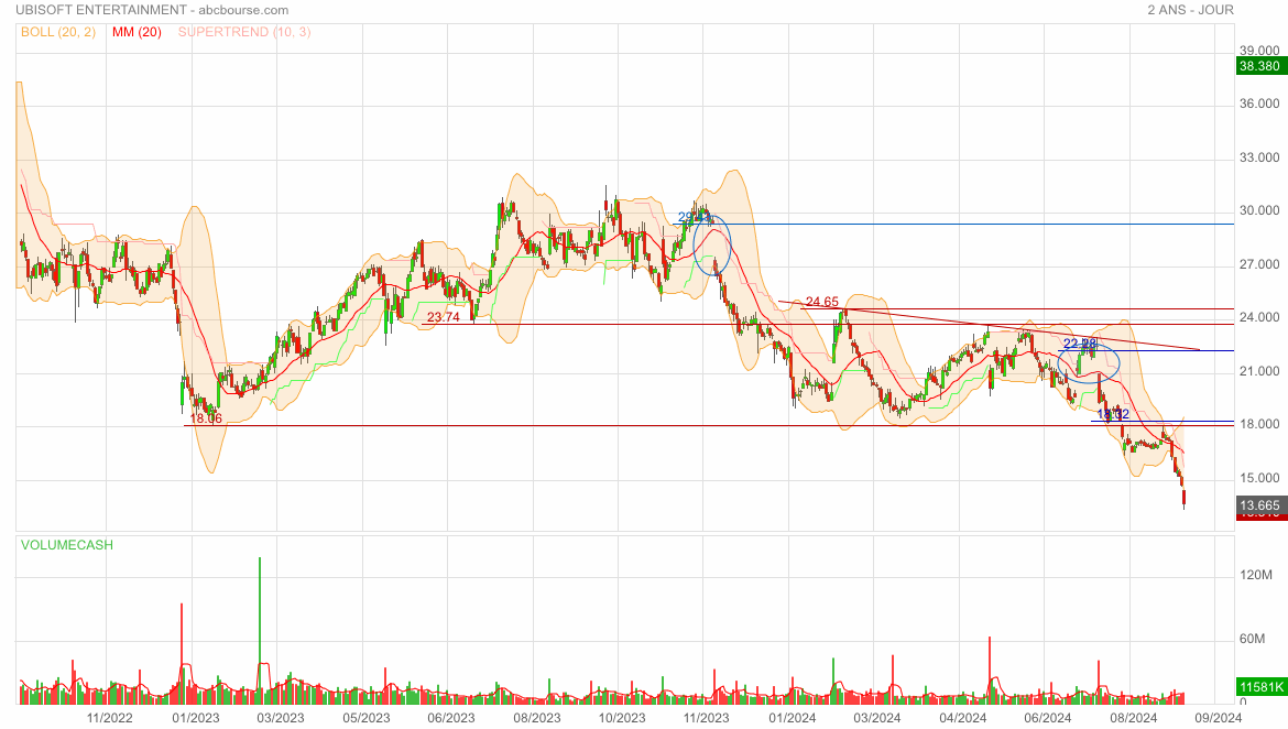 Cinquième séance de forte baisse pour Ubisoft qui cède 2% à 13 euros à l'ouverture du marché parisien, au plus bas depuis 2014. Malgré la récente sortie de 'Star Wars Outlaws', l'action du groupe de la famille Guillemot n'en finit plus de chuter... Les analystes se déchaînent puisqu'après Cantor Fitzgerald lundi, c'est au tour de BNP Paribas Exane de dégrader le titre de l'éditeur de jeux vidéo à 'neutre' tout en coupant sa cible de 32 à 14,5 euros. Morgan Stanley a de son côté ramené son objectif de 31,5 à 20 euros, en confirmant son avis 'pondération en ligne'.