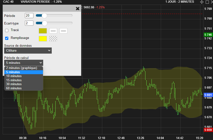 Comme sur l'exemple ci-dessous vous pouvez afficher une valeur avec ses cours en période 2 minutes mais par contre afficher ses bandes de Bollinger sur des données en période 5 minutes.